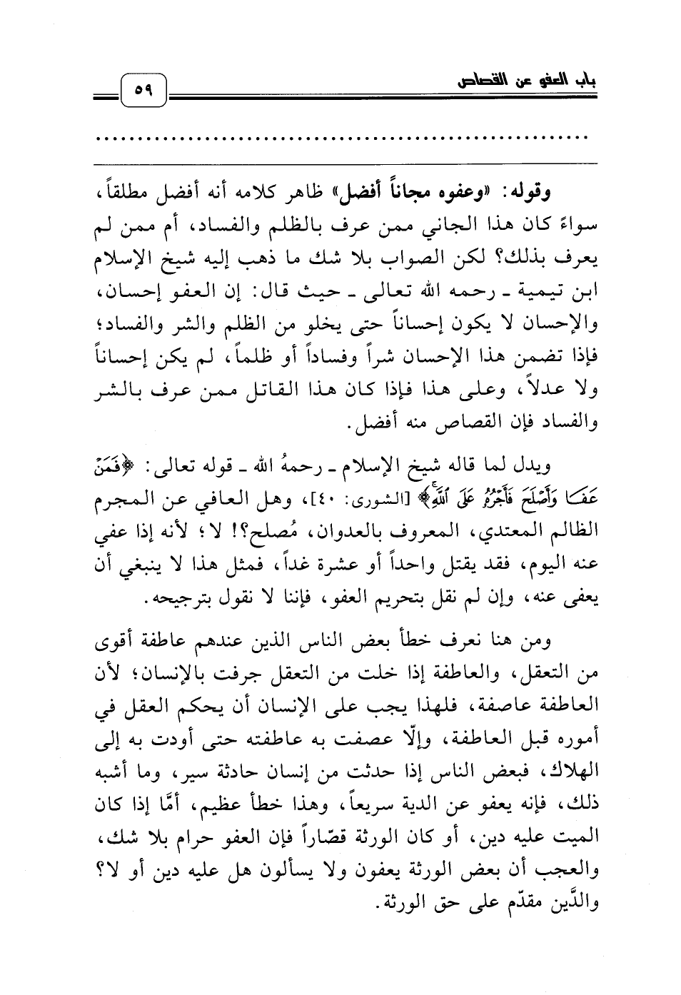 ويدل لما قاله شيخ الإسلام ـ رحمه الله ـ قوله تعالى: {فَمَنْ عَفَا وَأَصْلَحَ فَأَجْرُهُ عَلَى اللَّهِ} [الشورى: 40]، وهل العافي عن المجرم الظالم المعتدي، المعروف بالعدوان، مُصلح؟! لا؛ لأنه إذا عفي عنه اليوم، فقد يقتل واحداً أو عشرة غداً، فمثل هذا لا ينبغي أن يعفى عنه، وإن لم نقل بتحريم العفو، فإننا لا نقول بترجيحه.