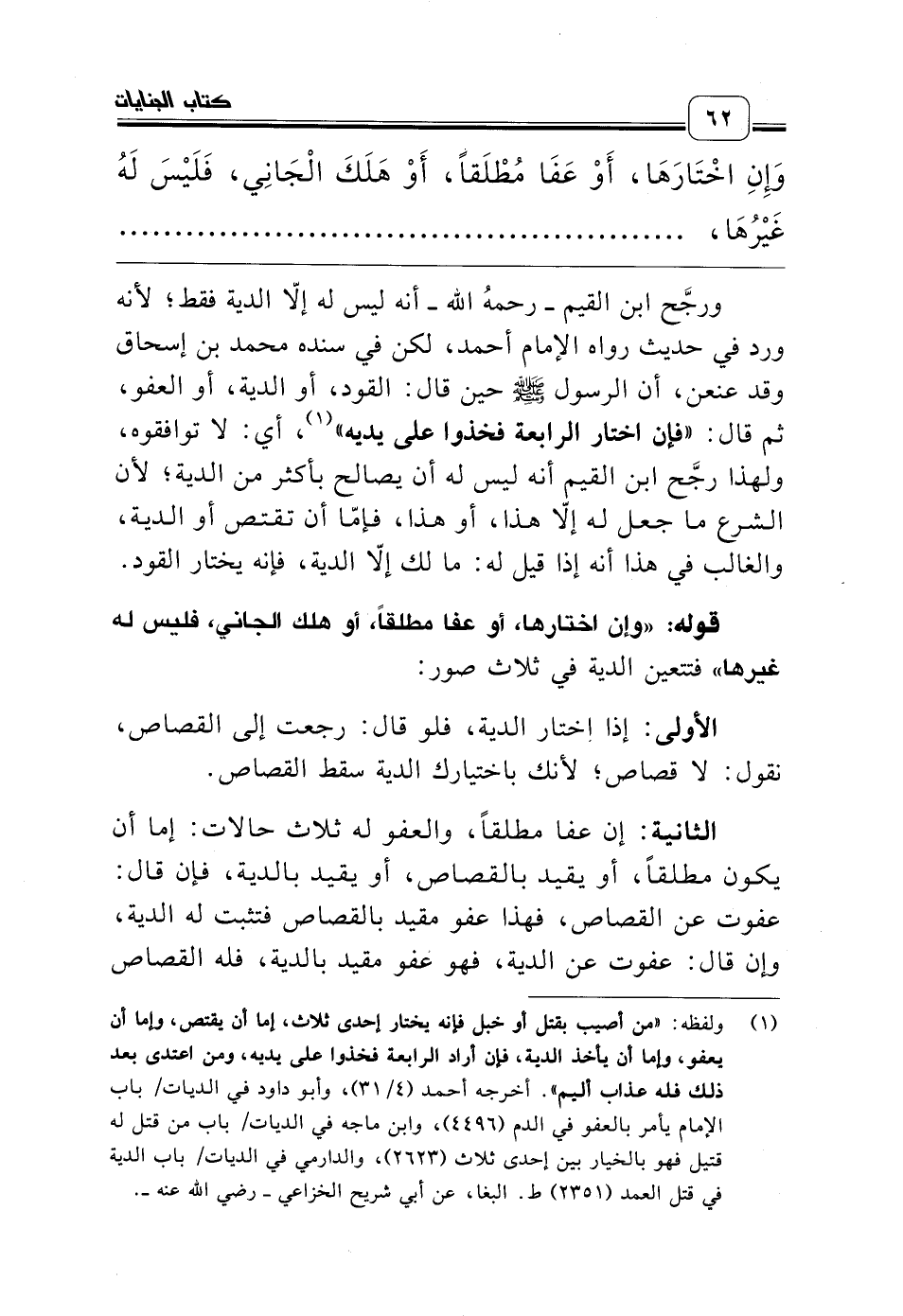 (¬1) ولفظه: «من أصيب بقتل أو خبل فإنه يختار إحدى ثلاث، إما أن يقتص، وإما أن يعفو، وإما أن يأخذ الدية، فإن أراد