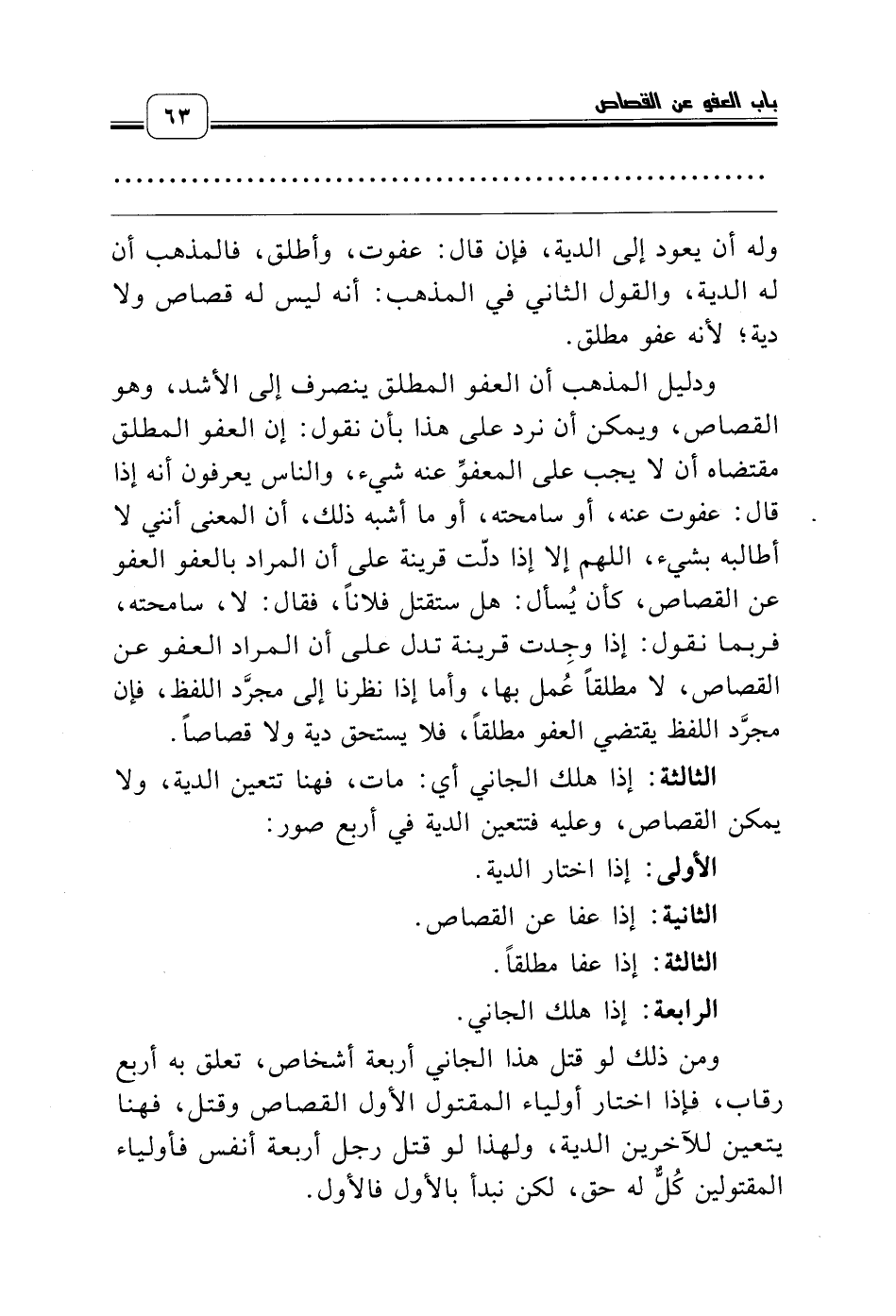 ودليل المذهب أن العفو المطلق ينصرف إلى الأشد، وهو القصاص، ويمكن أن نرد على هذا بأن نقول: إن العفو المطلق مقتضاه أن لا يجب على المعفوِّ عنه شيء، والناس يعرفون أنه إذا قال: عفوت عنه، أو سامحته، أو ما أشبه ذلك، أن المعنى أنني لا أطالبه بشيء، اللهم إلا إذا دلّت قرينة على أن المراد بالعفو العفو عن القصاص، كأن يُسأل: هل ستقتل فلاناً، فقال: لا، سامحته، فربما نقول: إذا وجِدت قرينة تدل على أن المراد العفو عن القصاص، لا مطلقاً عُمل بها، وأما إذا نظرنا إلى مجرَّد اللفظ، فإن مجرَّد اللفظ يقتضي العفو مطلقاً، فلا يستحق دية ولا قصاصاً.