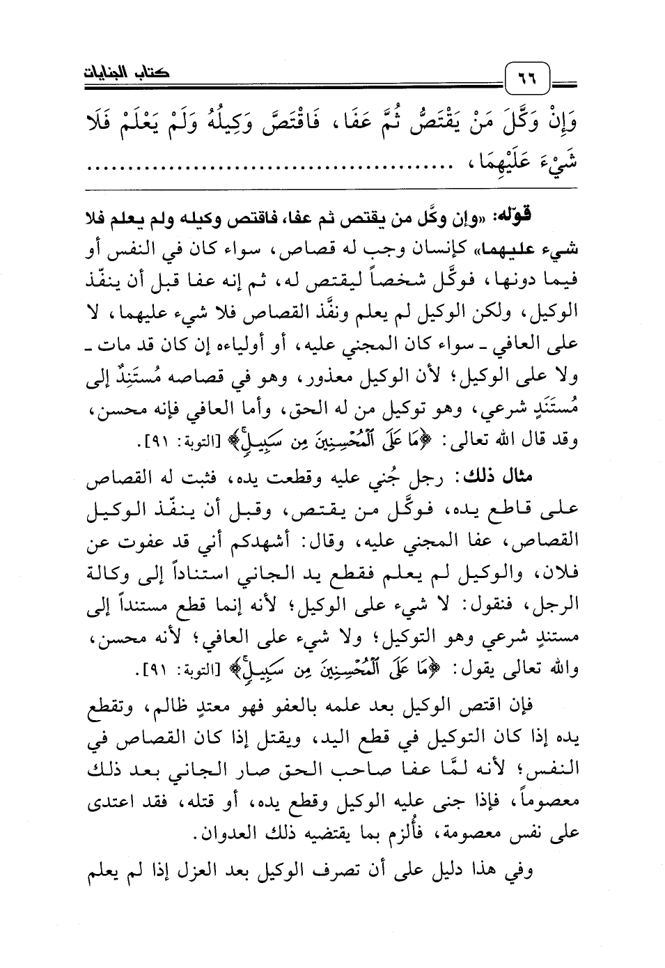 مثال ذلك: رجل جُني عليه وقطعت يده، فثبت له القصاص على قاطع يده، فوكَّل من يقتص، وقبل أن ينفّذ الوكيل القصاص، عفا المجني عليه، وقال: أشهدكم أني قد عفوت عن فلان، والوكيل لم يعلم فقطع يد الجاني استناداً إلى وكالة الرجل، فنقول: لا شيء على الوكيل؛ لأنه إنما قطع مستنداً إلى مستندٍ شرعي وهو التوكيل؛ ولا شيء على العافي؛ لأنه محسن، والله تعالى يقول: {مَا عَلَى الْمُحْسِنِينَ مِنْ سَبِيلٍ} [التوبة: 91].
