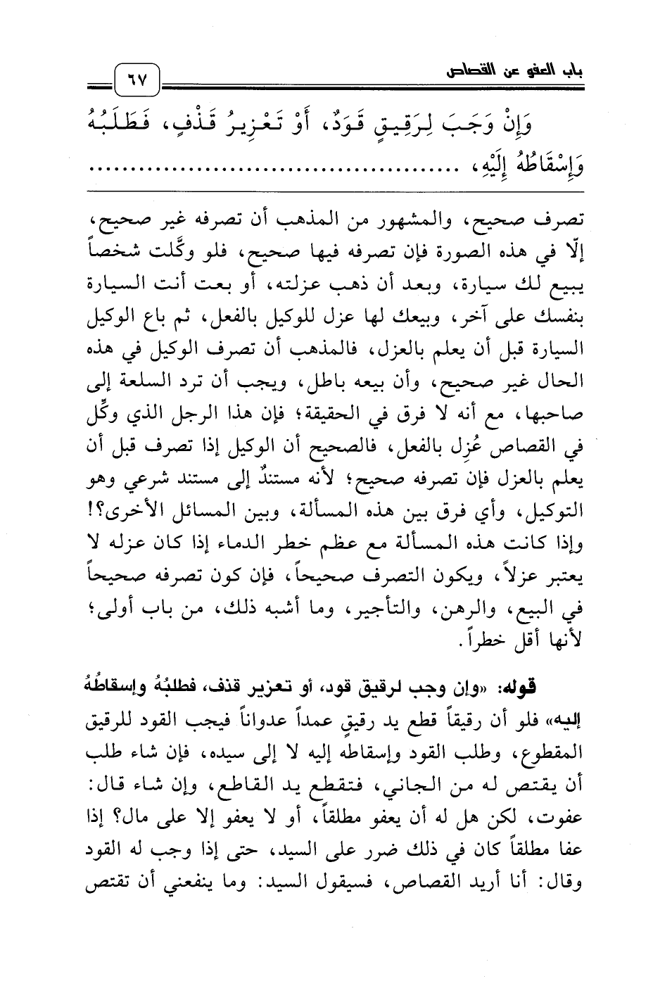 قوله: «وإن وجب لرقيق قود، أو تعزير قذف، فطلبُهُ وإسقاطُهُ إليه» فلو أن رقيقاً قطع يد رقيقٍ عمداً عدواناً فيجب القود للرقيق المقطوع، وطلب القود وإسقاطه إليه لا إلى سيده، فإن شاء طلب أن يقتص له من الجاني، فتقطع يد القاطع، وإن شاء قال: عفوت، لكن هل له أن يعفو مطلقاً، أو لا يعفو إلا على مال؟ إذا عفا مطلقاً كان في ذلك ضرر على السيد، حتى إذا وجب له القود وقال: أنا أريد القصاص، فسيقول السيد: وما ينفعني أن تقتص