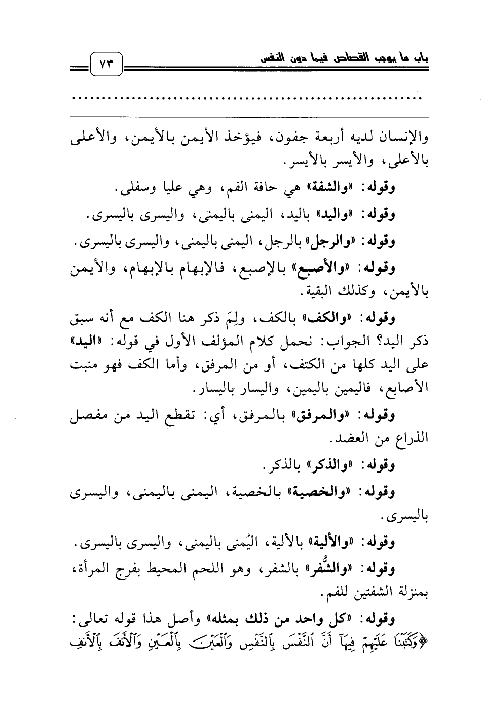 وقوله: «والكف» بالكف، ولِمَ ذكر هنا الكف مع أنه سبق ذكر اليد؟ الجواب: نحمل كلام المؤلف الأول في قوله: «اليد» على اليد كلها من الكتف، أو من المرفق، وأما الكف فهو منبت الأصابع، فاليمين باليمين، واليسار باليسار.