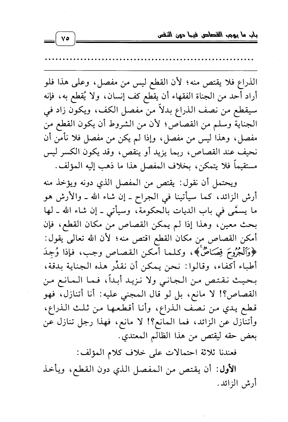 ويحتمل أن نقول: يقتص من المفصل الذي دونه ويؤخذ منه أرش الزائد، كما سيأتينا في الجراح ـ إن شاء الله ـ والأرش هو ما يسمَّى في باب الديات بالحكومة، وسيأتي ـ إن شاء الله ـ لها بحث معين، وهذا إذا لم يمكن القصاص من مكان القطع، فإن أمكن القصاص من مكان القطع اقتص منه؛ لأن الله تعالى يقول: {وَالْجُرُوحَ قِصَاصٌ}، وكلما أمكن القصاص وجب، فإذا وُجِدَ أطباء أكفاء، وقالوا: نحن يمكن أن نقدِّر هذه الجناية بدقة، بحيث نقتص من الجاني ولا نزيد أبداً، فما المانع من القصاص؟! لا مانع، بل لو قال المجني عليه: أنا أتنازل، فهو قطع يدي من نصف الذراع، وأنا أقطعها من ثلث الذراع، وأتنازل عن الزائد، فما المانع؟! لا مانع، فهذا رجل تنازل عن بعض حقه ليقتص من هذا الظالم المعتدي.