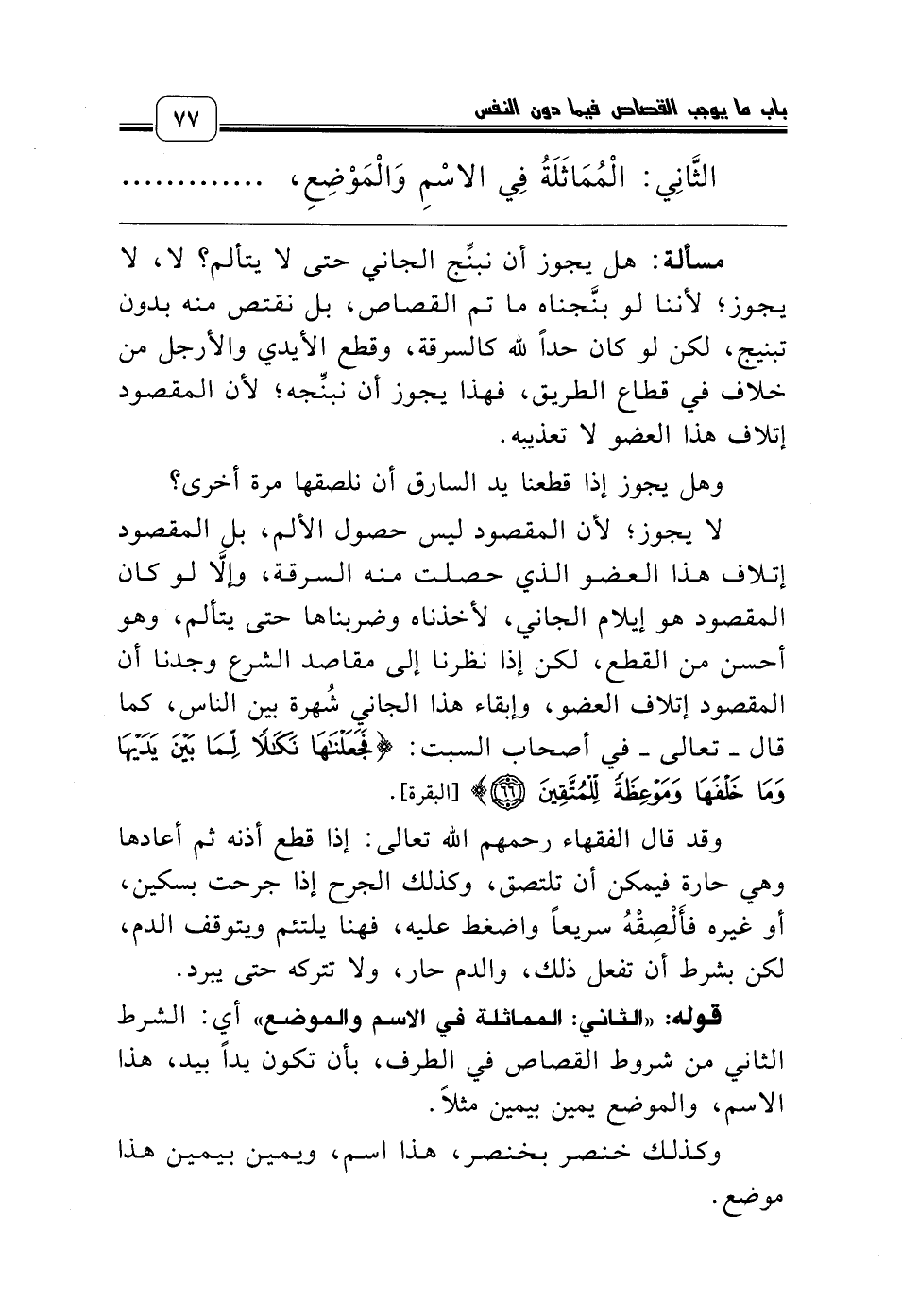 قوله: «الثاني: المماثلة في الاسم والموضع» أي: الشرط الثاني من شروط القصاص في الطرف، بأن تكون يداً بيد، هذا الاسم، والموضع يمين بيمين مثلاً.