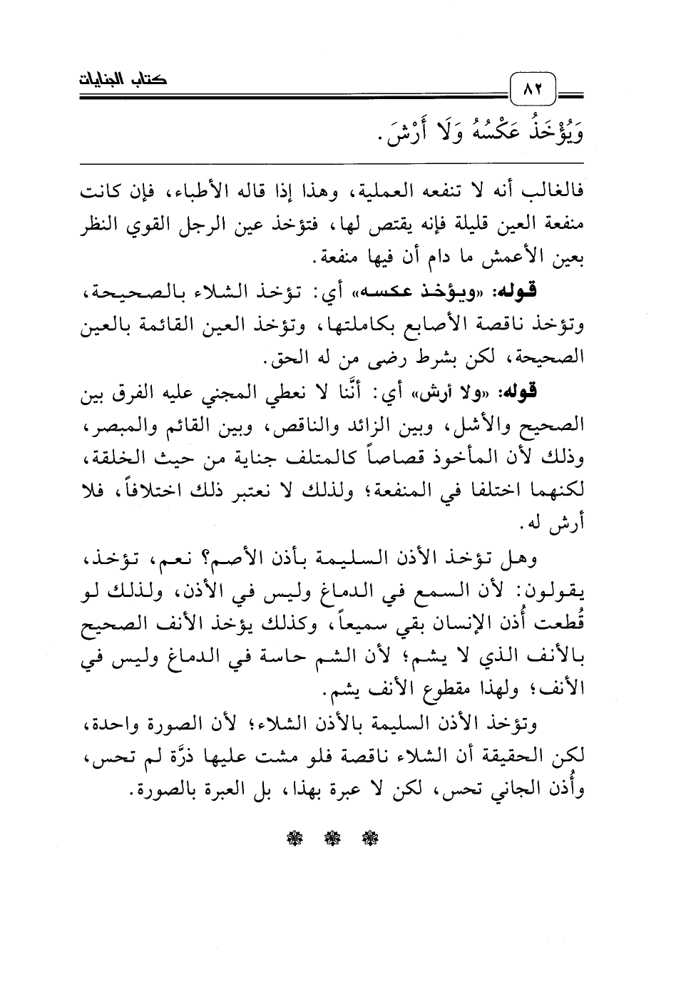 وتؤخذ الأذن السليمة بالأذن الشلاء؛ لأن الصورة واحدة، لكن الحقيقة أن الشلاء ناقصة فلو مشت عليها ذرَّة لم تحس، وأُذن الجاني تحس، لكن لا عبرة بهذا، بل العبرة بالصورة.