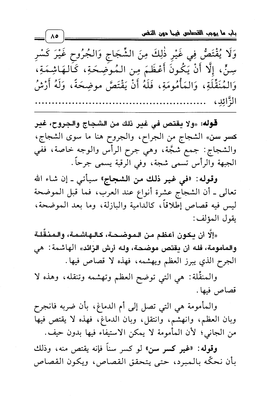 قوله: «ولا يقتص في غير ذلك من الشجاج والجروح، غير كسر سن» الشجاج من الجراح، والجروح هنا ما سوى الشجاج، والشجاج: جمع شجَّة، وهي جرح الرأس والوجه خاصة، ففي الجبهة والرأس تسمى شجة، وفي الرقبة يسمى جرحاً.