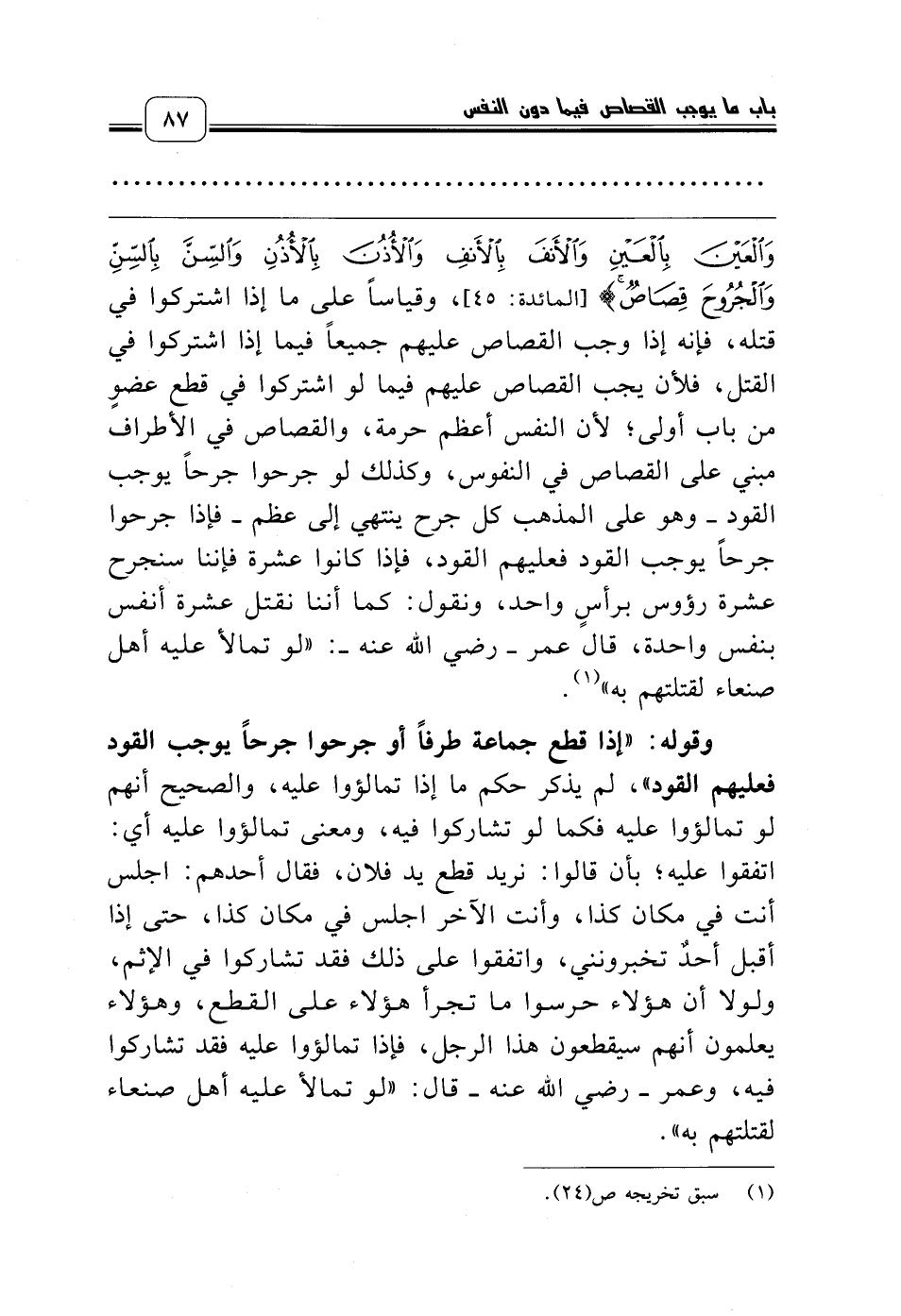 وَالْعَيْنَ بِالْعَيْنِ وَالأَنْفَ بِالأَنْفِ وَالأُذُنَ بِالأُذُنِ وَالسِّنَّ بِالسِّنِّ وَالْجُرُوحَ قِصَاصٌ} [المائدة: 45]، وقياساً على ما إذا اشتركوا في قتله، فإنه إذا وجب القصاص عليهم جميعاً فيما إذا اشتركوا في القتل، فلأن يجب القصاص عليهم فيما لو اشتركوا في قطع عضوٍ من باب أولى؛ لأن النفس أعظم حرمة، والقصاص في الأطراف مبني على القصاص في النفوس، وكذلك لو جرحوا جرحاً يوجب القود ـ وهو على المذهب كل جرح ينتهي إلى عظم ـ فإذا جرحوا جرحاً يوجب القود فعليهم القود، فإذا كانوا عشرة فإننا سنجرح عشرة رؤوس برأسٍ واحد، ونقول: كما أننا نقتل عشرة أنفس بنفس واحدة، قال عمر ـ رضي الله عنه ـ: «لو تمالأ عليه أهل صنعاء لقتلتهم به» (¬1).
