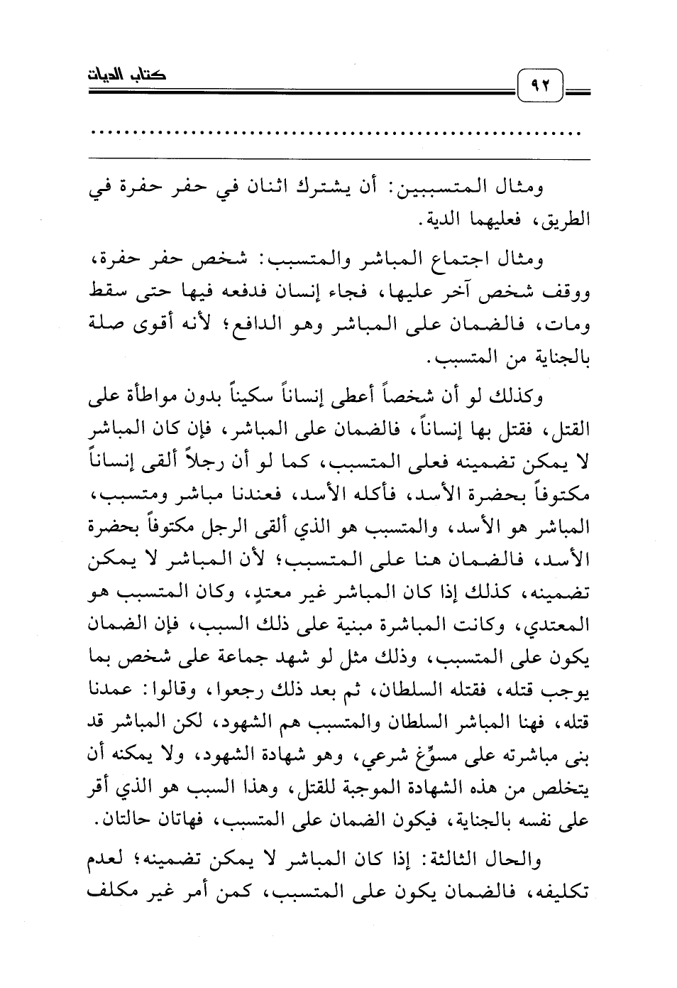 ومثال اجتماع المباشر والمتسبب: شخص حفر حفرة، ووقف شخص آخر عليها، فجاء إنسان فدفعه فيها حتى سقط ومات، فالضمان على المباشر وهو الدافع؛ لأنه أقوى صلة بالجناية من المتسبب.