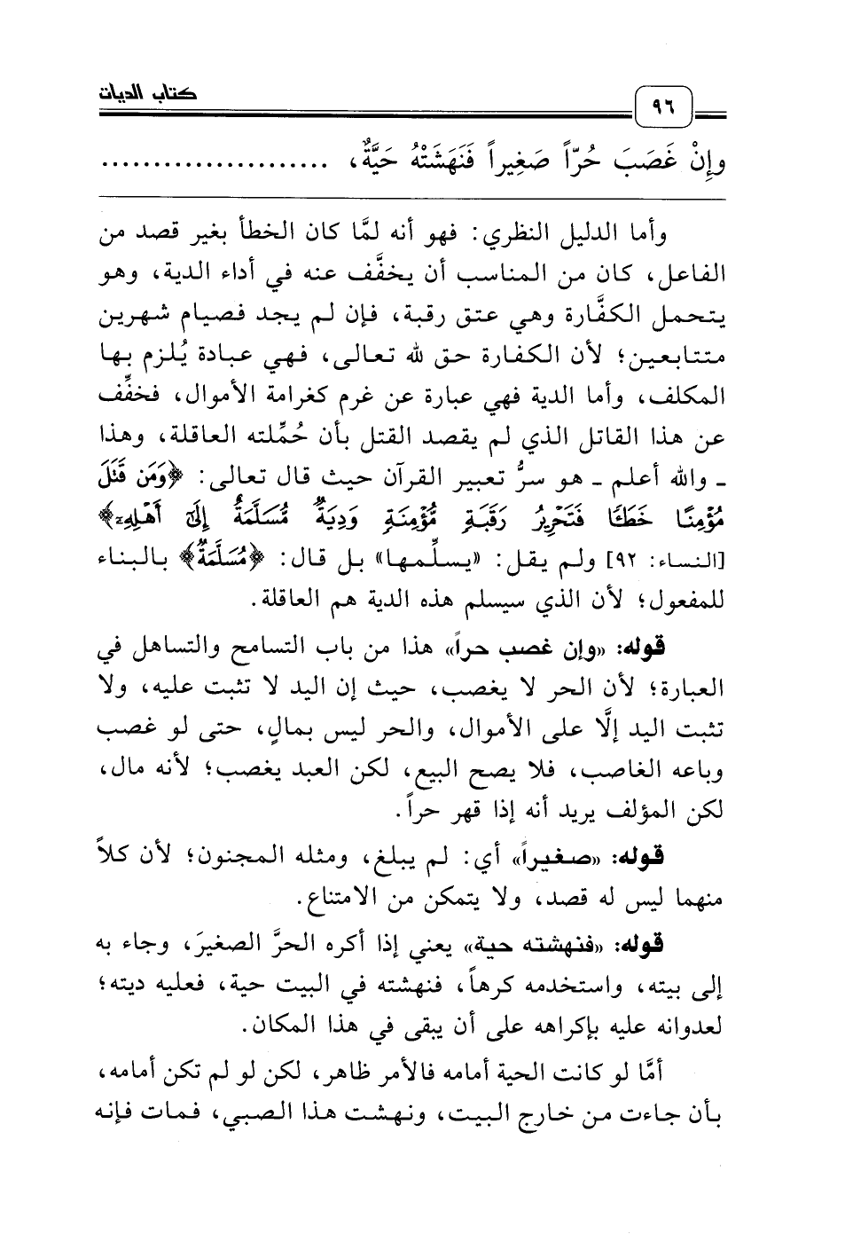وأما الدليل النظري: فهو أنه لمَّا كان الخطأ بغير قصد من الفاعل، كان من المناسب أن يخفَّف عنه في أداء الدية، وهو يتحمل الكفَّارة وهي عتق رقبة، فإن لم يجد فصيام شهرين متتابعين؛ لأن الكفارة حق لله تعالى، فهي عبادة يُلزم بها المكلف، وأما الدية فهي عبارة عن غرم كغرامة الأموال، فخفِّف عن هذا القاتل الذي لم يقصد القتل بأن حُمِّلته العاقلة، وهذا ـ والله أعلم ـ هو سرُّ تعبير القرآن حيث قال تعالى: {وَمَنْ قَتَلَ مُؤْمِناً خَطَأً فَتَحْرِيرُ رَقَبَةٍ مُؤْمِنَةٍ وَدِيَةٌ مُسَلَّمَةٌ إِلَى أَهْلِهِ} [النساء: 92] ولم يقل: «يسلِّمها» بل قال: {مُسَلَّمَةٌ} بالبناء للمفعول؛ لأن الذي سيسلم هذه الدية هم العاقلة.