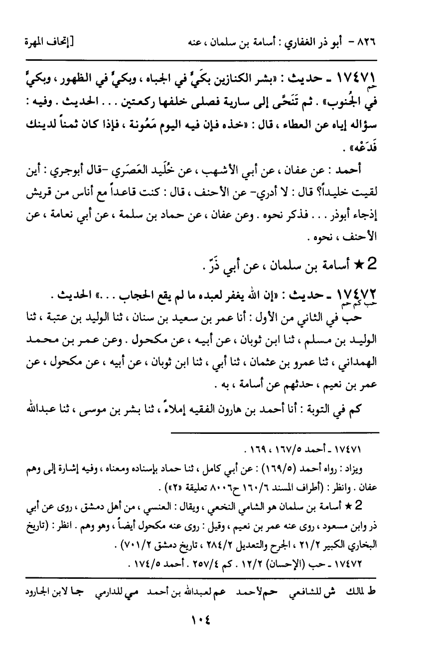 أحمد: عن عفان، عن أبي الأشهب، عن خُلَيد العَصَري - قال أبو جري: أين لقيت خليداً؟ قال: لا أدري - عن الأحنف، قال: كنت قاعداً مع أناس من قريش إذ جاء أبو ذر ... فذكر نحوه. وعن عفان، عن حماد بن سلمة، عن أبي نعامة، عن الأحنف، نحوه.