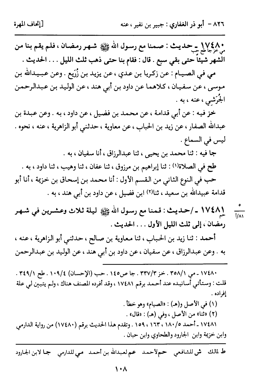 17480 - حديث (مي خز جا طح حب) : صمنا مع رسول الله - صَلَّى اللَّهُ عَلَيْهِ وَسَلَّمَ - شهر رمضان، فلم يقم بنا من الشهر شيئاً حتى بقى سبع. قال: فقام بنا حتى ذهب ثلث الليل ... الحديث.