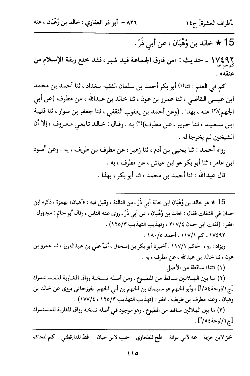 17492 - حديث (كم حم عم) : "من فارق الجماعة قيد شبر، فقد خلع ربقة الإسلام من عنقه".