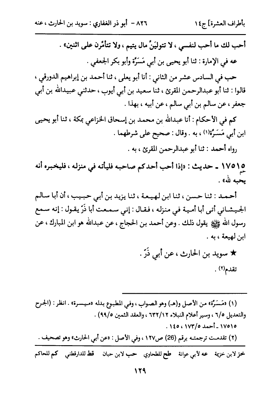أحمد: ثنا حسن، ثنا ابن لهيعة، ثنا يزيد بن أبي حبيب، أن أبا سالم الجيشاني أتى أبا أمية في منزله، فقال: إني سمعت أبا ذَرّ يقول: إنه سمع رسول الله - صَلَّى اللَّهُ عَلَيْهِ وَسَلَّمَ - يقول ذلك. وعن أحمد بن الحجاج، عن عبد الله هو ابن المبارك، عن ابن لهيعة، به.