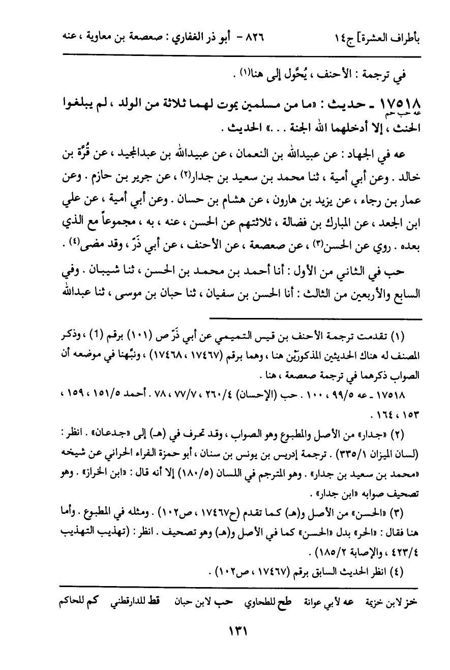 عه في الجهاد: عن عبيد الله بن النعمان، عن عبيد الله بن عبد المجيد، عن قُرة بن خالد. وعن أبي أمية، ثنا محمد بن سعيد بن جدار، عن جرير بن حازم. وعن عمار بن رجاء، عن يزيد بن هارون، عن هشام بن حسان. وعن أبي أمية، عن علي ابن الجعد، عن المبارك بن فضالة، ثلاثتهم عن الحسن، عنه، به، مجموعاً مع الذي بعده. روي عن الحسن، عن صعصعة، عن الأحنف، عن أبي ذَر، وقد مضى.