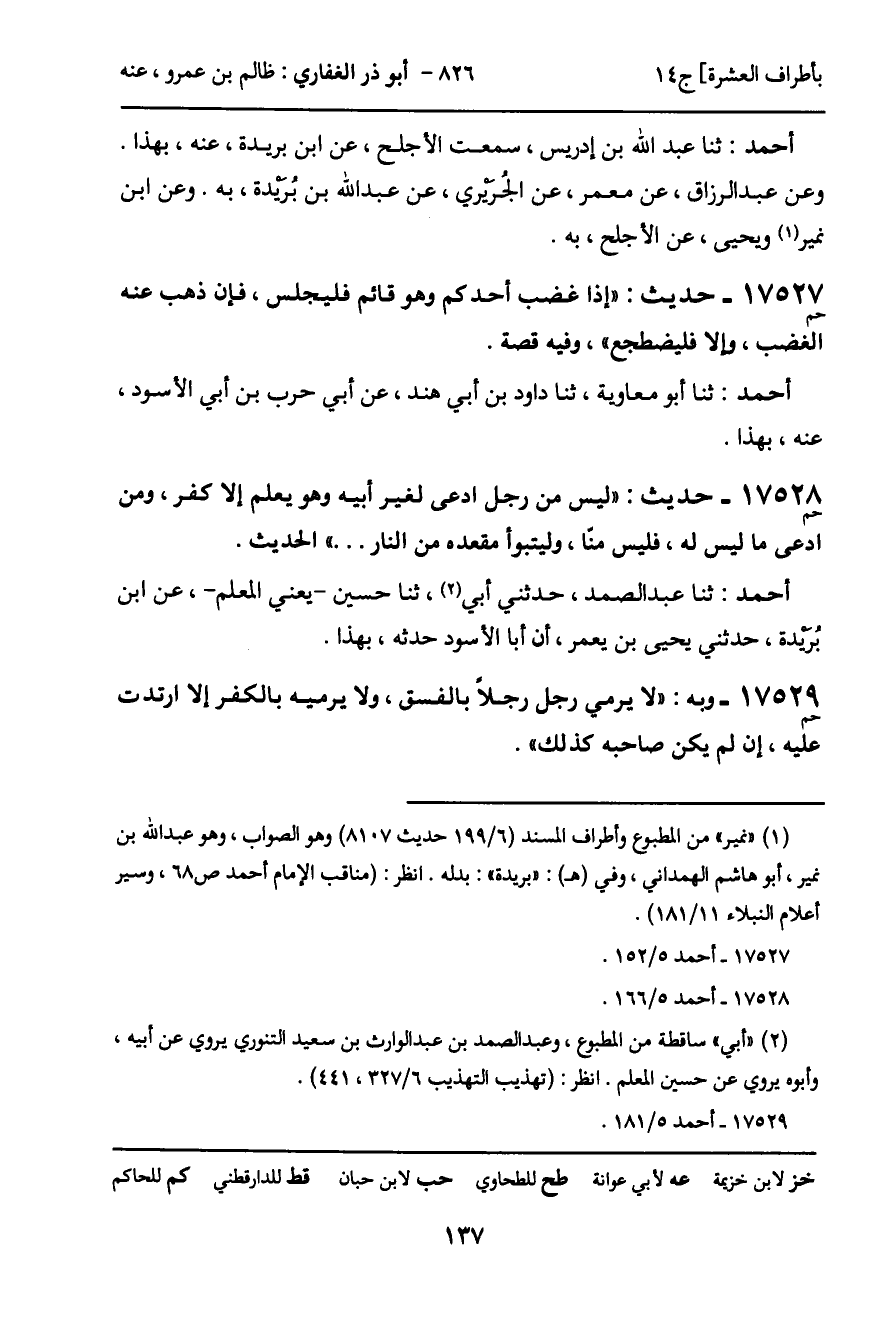 17528 - حديث (حم) : "ليس من رجل ادعى لغير أبيه وهو يعلم إلا كفر، ومن ادعى ما ليس له، فليس منا، وليتبوأ مقعده من النار ... " الحديث.