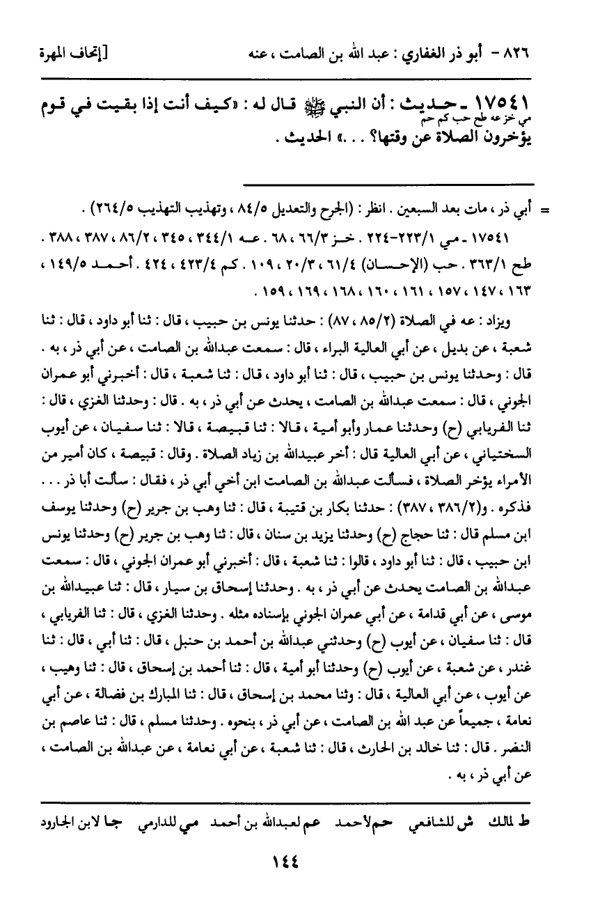 رواه أحمد بلفظ: "يا أبا ذر صل الصلاة لوقتها، فإن أتيت الناس وقد صلوا، كنت قد أحرزت صلاتك ... " الحديث: ثنا مرحوم بن عبد العزيز العطار، حدثني أبو عمران، عنه، به. وعن عبد العزيز بن عبد الصمد، عن أبي عمران، به في حديث. وعن عبد الرزاق، عن سفيان، عن أيوب، عن أبي العالية قال: أَخر عبيد الله بن زياد الصلاة، فسألت عبد الله بن الصامت ... فذكر نحوه. وعن وكيع وحجاج ومحمد بن جعفر، عن شعبة، عن أبي عمران، به. وعن إسماعيل، عن أيوب، نحوه. وعن محمد بن جعفر، عن شعبة، عن أيوب، به. وعن أبي عامر، عن شعبة، عن بديل بن ميسرة، سمعت أبا العالية البَراء، به. وعن إسماعيل، عن