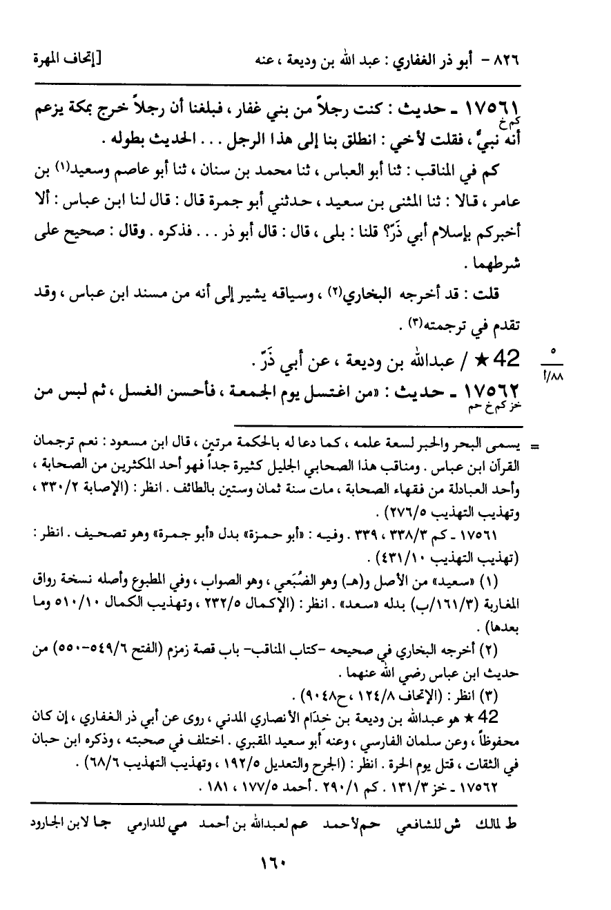 كم في المناقب: ثنا أبو العباس، ثنا محمد بن سنان، ثنا أبو عاصم وسعيد بن عامر، قالا: ثنا المثنى بن سعيد، حدثني أبو جمرة قال: قال لنا ابن عباس: ألا أخبركم بإسلام أبي ذَر؟ قلنا: بلى، قال: قال أبو ذر ... فذكره. وقال: صحيح على شرطهما.