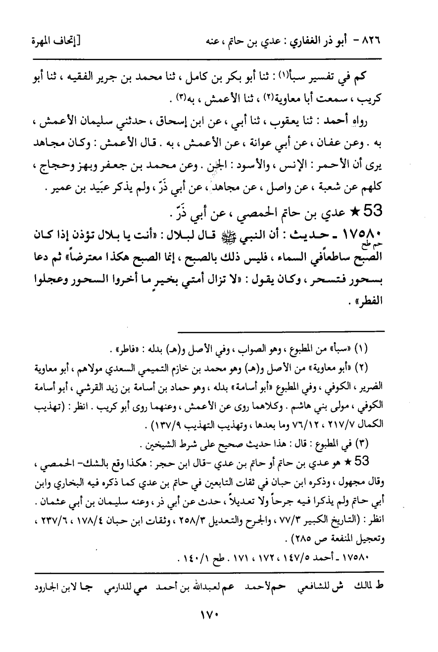 17580 - حديث (حم طح) : أن النبي - صَلَّى اللَّهُ عَلَيْهِ وَسَلَّمَ - قال لبلال: "أنت يا بلال تؤذن إذا كان الصبح ساطعاً في السماء، فليس ذلك بالصبح، إنما الصبح هكذا معترضاً" ثم دعا بسحور فتسحر، وكان يقول: "لا تزال أمتي بخير ما أخروا السحور وعجلوا الفطر".