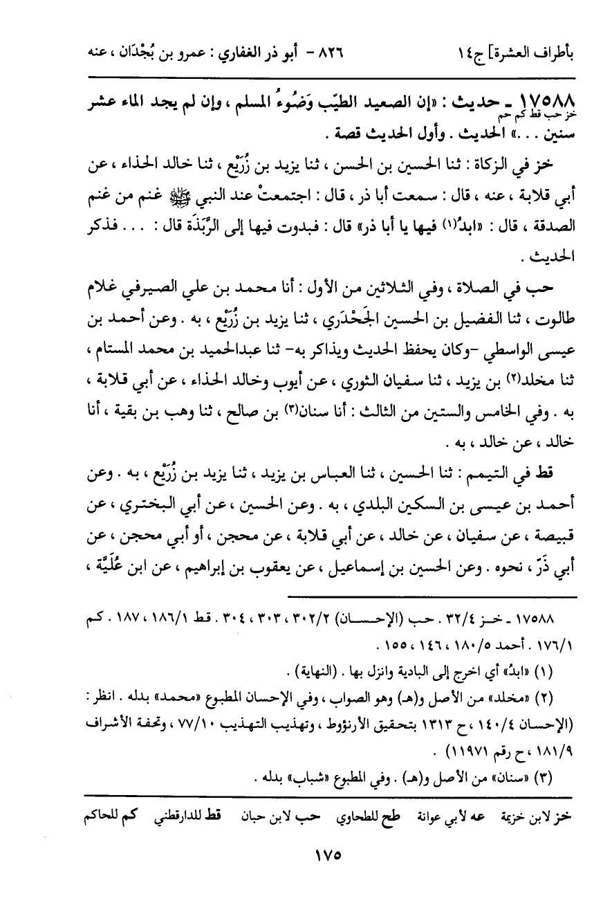 17588 - حديث (خز حب قط كم حم) : "إن الصعيد الطيب وَضُوء المسلم، وإن لم يجد الماء عشر سنين ... " الحديث. وأول الحديث قصة.