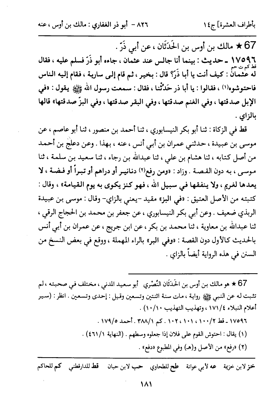 17596 - حديث (قط كم ت حم) : بينما أنا جالس عند عثمان، جاءه أبو ذَر فسلم عليه، فقال له عثمان: كيف أنت يا أبا ذَر؟ قال: بخير، ثم قام إلى سارية، فقام إليه الناس فاحتوشوه، فقالوا: يا أبا ذر حَدثنا، فقال: سمعت رسول الله - صَلَّى اللَّهُ عَلَيْهِ وَسَلَّمَ - يقول: "في الإبل صدقتها، وفي الغنم صدقتها، وفي البقر صدقتها، وفي البزّ صدقتها" قالها بالزاي.