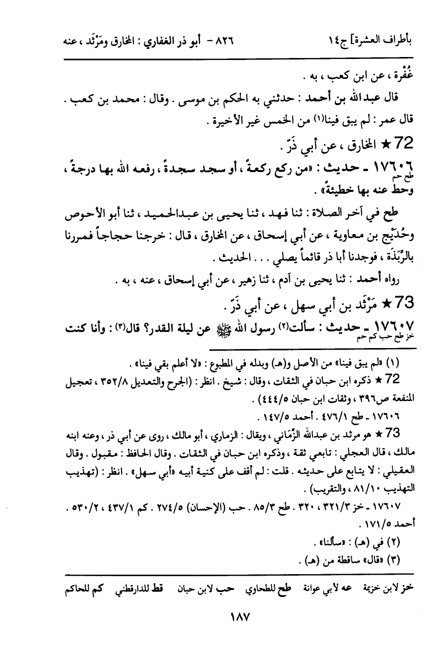 طح في آخر الصلاة: ثنا فهد، ثنا يحيى بن عبد الحميد، ثنا أبو الأحوص وحديج بن معاوية، عن أبي إسحاق، عن المخارق، قال: خرجنا حجاجاً فمررنا بالربذَة، فوجدنا أبا ذر قائماً يصلي ... الحديث.