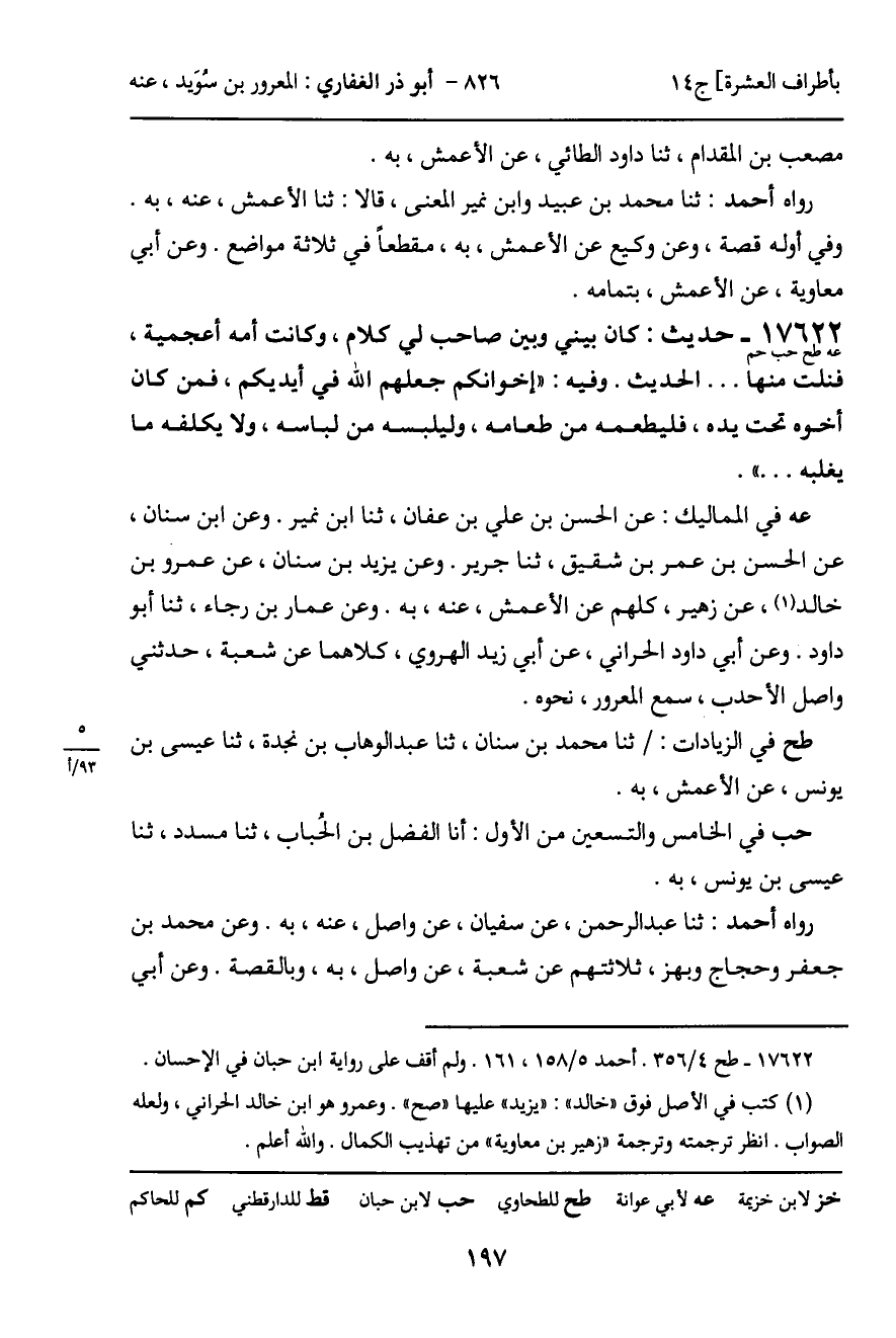 عه في المماليك: عن الحسن بن علي بن عفان، ثنا ابن نمير. وعن ابن سنان، عن الحسن بن عمر بن شقيق، ثنا جرير. وعن يزيد بن سنان، عن عمرو بن خالد، عن زهير، كلهم عن الأعمش، عنه، به. وعن عمار بن رجاء، ثنا أبو داود. وعن أبي داود الحراني، عن أبي زيد الهروي، كلاهما عن شعبة، حدثني واصل الأحدب، سمع المعرور، نحوه.