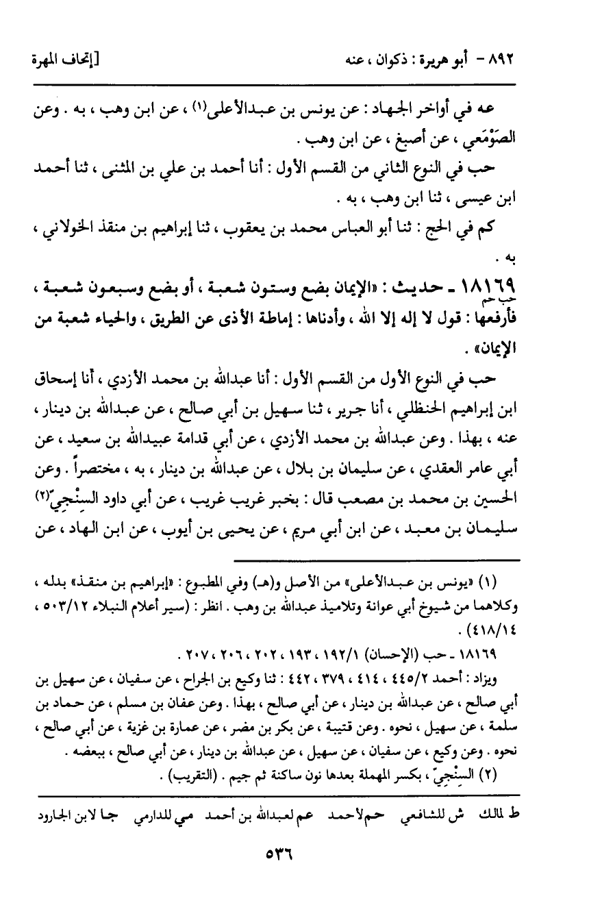 حب في النوع الأول من القسم الأول: أنا عبد الله بن محمد الأزدي، أنا إسحاق ابن إبراهيم الحنظلي، أنا جرير، ثنا سهيل بن أبي صالح، عن عبد الله بن دينار، عنه، بهذا. وعن عبد الله بن محمد الأزدي، عن أبي قدامة عبيد الله بن سعيد، عن أبي عامر العقدي، عن سليمان بن بلال، عن عبد الله بن دينار، به، مختصراً. وعن الحسين بن محمد بن مصعب قال: بخبر غريب غريب، عن أبي داود السِنْجِي سليمان بن معبد، عن ابن أبي مريم، عن يحيى بن أيوب، عن ابن الهاد، عن
