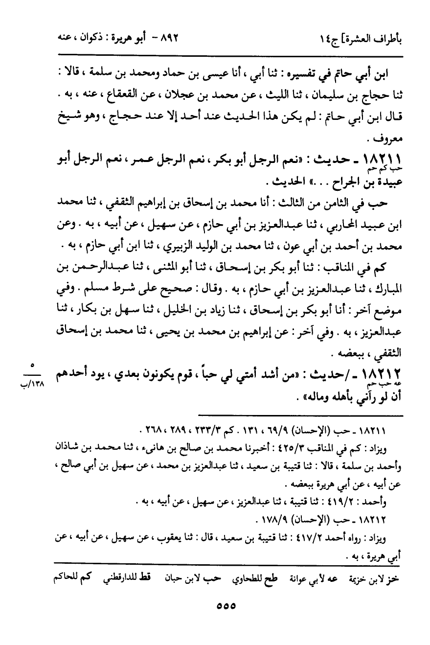 18212 - حديث (عه حب حم) : "من أشد أمتي لي حباً، قوم يكونون بعدي، يود أحدهم أن لو رآني بأهله وماله".
