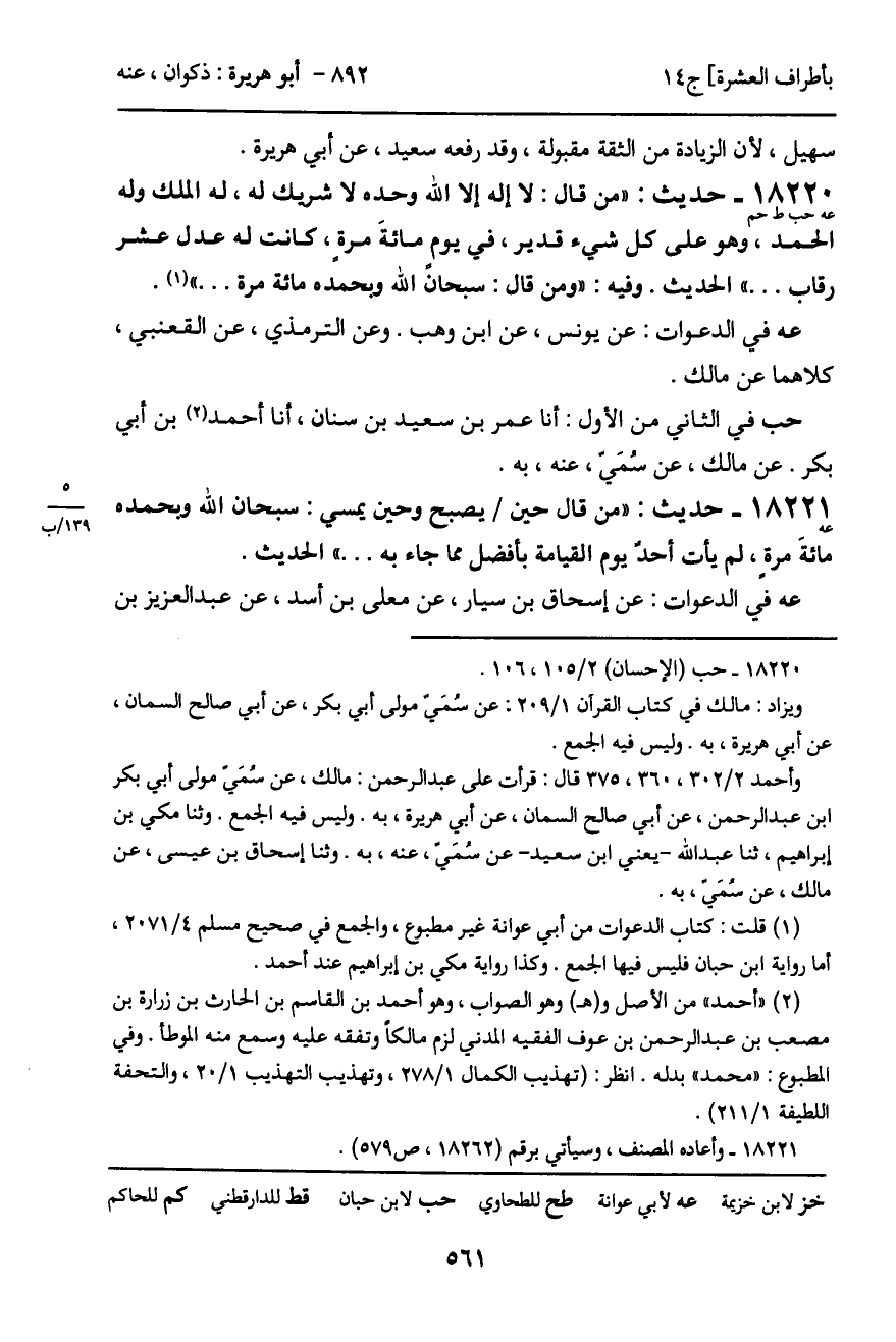 18220 - حديث (عه حب ط حم) : "من قال: لا إله إلا الله وحده لا شريك له، له الملك وله الحمد، وهو على كل شيء قدير، في يوم مائة مرة، كانت له عدل عشر رقاب ... " الحديث. وفيه: "ومن قال: سبحان الله وبحمده مائة مرة ... ".