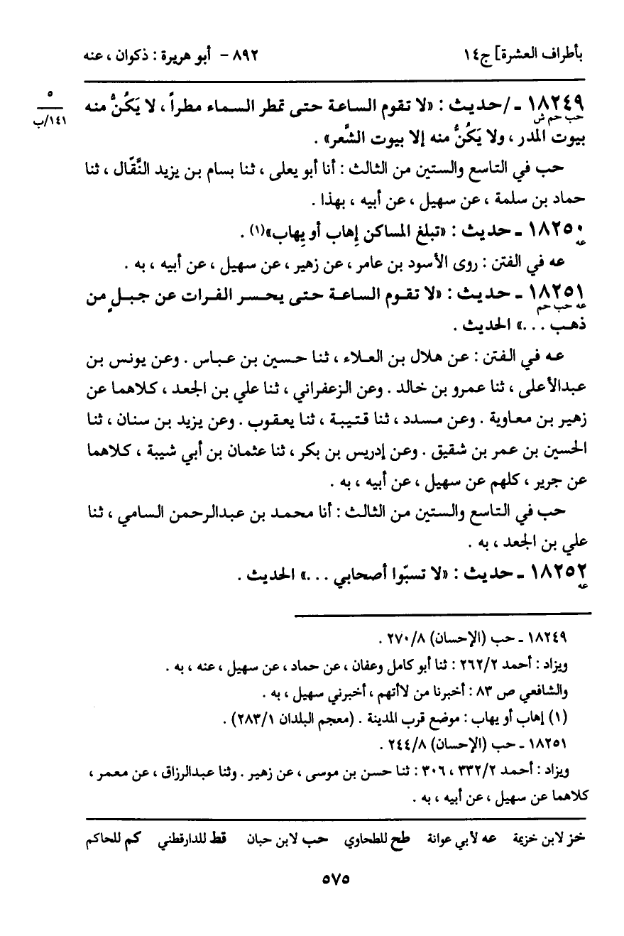 18251 - حديث (عه حب حم) : "لا تقوم الساعة حتى يحسر الفرات عن جبل من ذهب ... " الحديث.