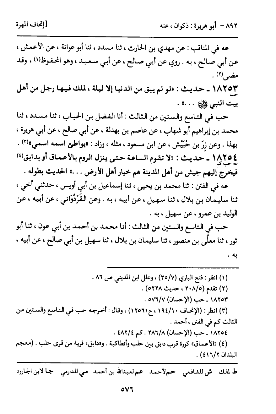 حب في التاسع والستين من الثالث: أنا الفضل بن الحباب، ثنا مسدد، ثنا محمد بن إبراهيم أبو شهاب، عن عاصم بن بهدلة، عن أبي صالح، عن أبي هريرة، بهذا. وعن زِر بن حبيش، عن ابن مسعود، مثله، وزاد: "يواطئ اسمه اسمي".