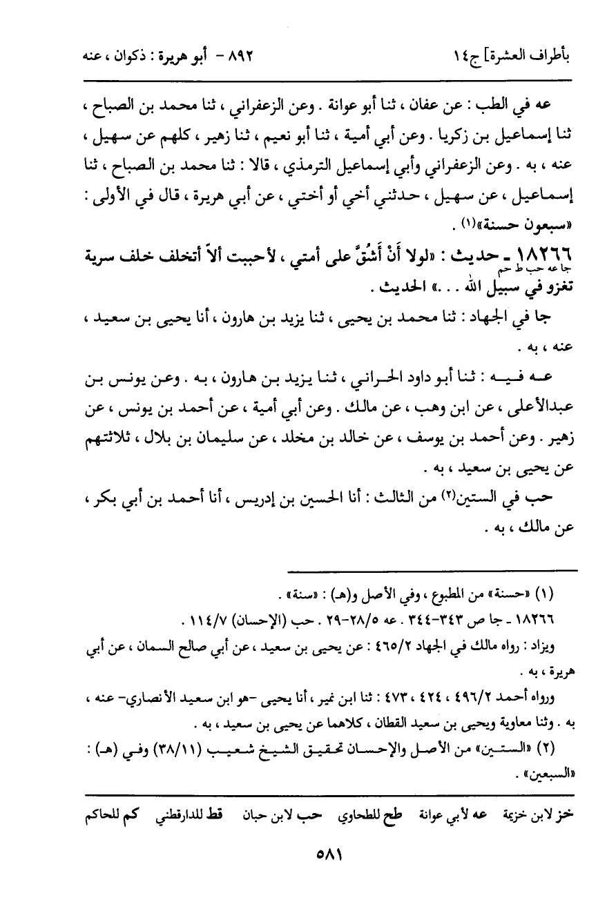 18266 - حديث (جا عه حب ط حم) : "لولا أنْ أشق على أمتي، لأحببت ألا أتخلف خلف سرية تغزو في سبيل الله ... " الحديث.