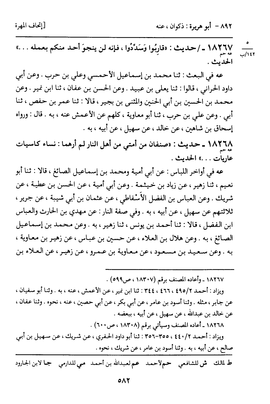 18268 - حديث (عه حم) : "صنفان من أمتي من أهل النار لم أرهما: نساء كاسيات عاريات ... " الحديث.