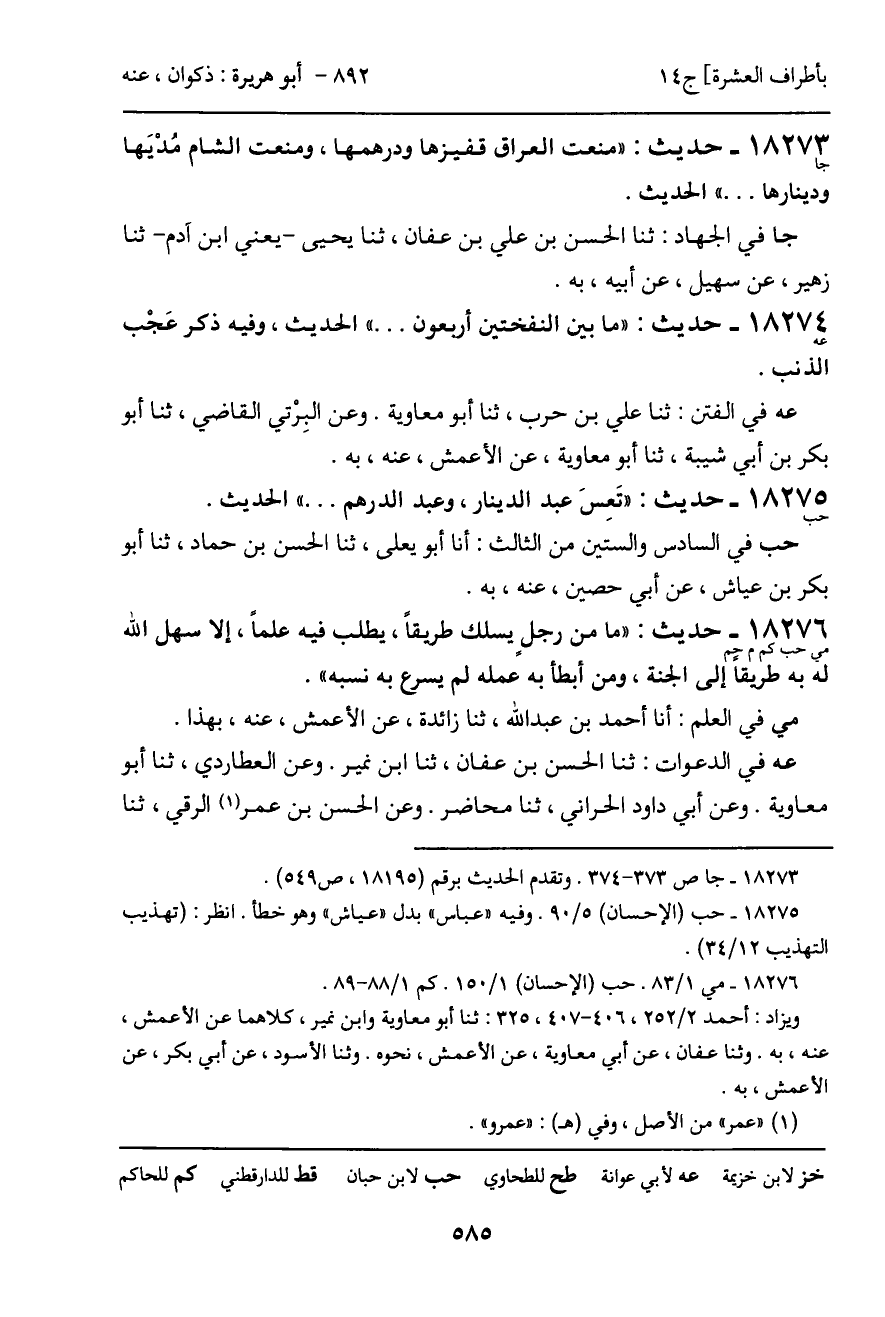 كم في العلم: ثنا محمد بن يعقوب الحافظ، ثنا السري بن خزيمة، ثنا أحمد بن يونس، به. (وعن يحيى بن محمد العنبري، ثنا إبراهيم بن أبي طالب، ثنا أبو كريب وسَلْم بن جُنَادة، قالا: ثنا أبو معاوية وهو محمد بن خازم، به) . وعن محمد بن يعقوب، ثنا الحسن بن علي بن عفان، ثنا ابن نمير، عن الأعمش، به، ولم يذكر آخره، وزعم أن زائدة تفرد به ووقفه غيره، وأنه على شرط الشيخين، ولم يخرجاه.
