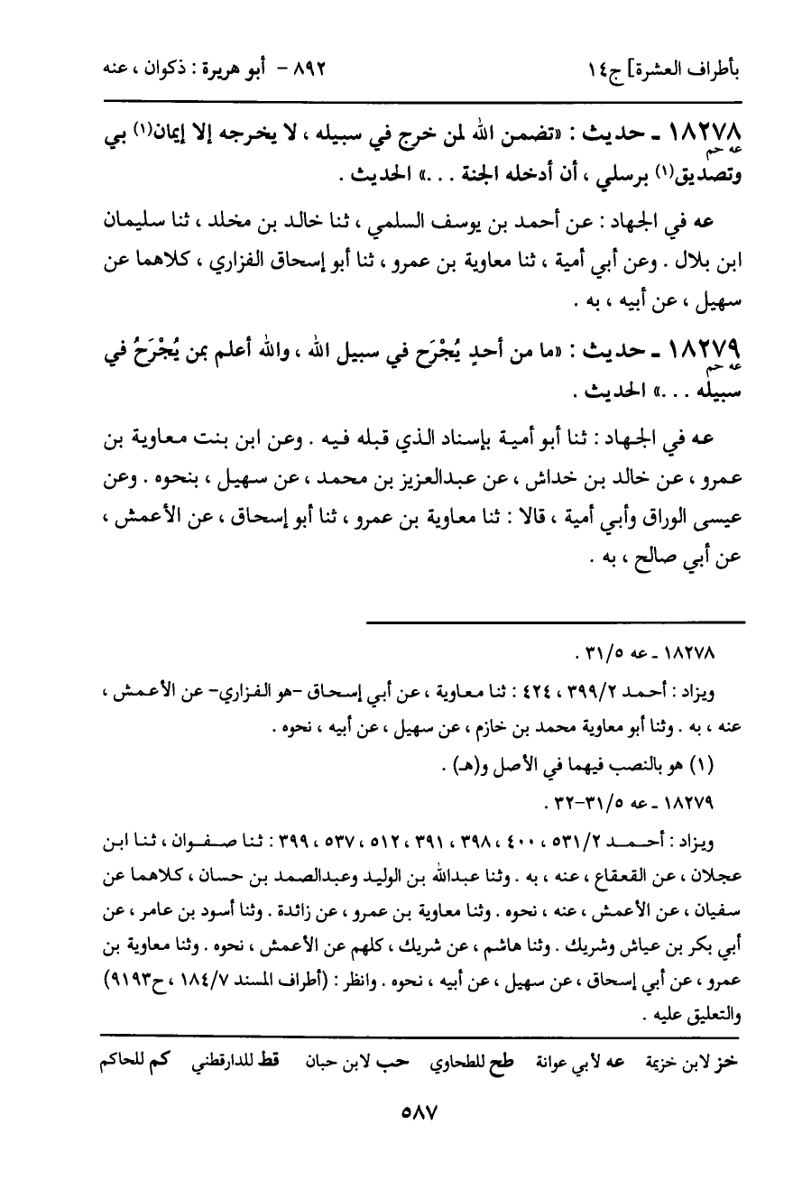 عه في الجهاد: عن أحمد بن يوسف السلمي، ثنا خالد بن مخلد، ثنا سليمان ابن بلال. وعن أبي أمية، ثنا معاوية بن عمرو، ثنا أبو إسحاق الفزاري، كلاهما عن سهيل، عن أبيه، به.