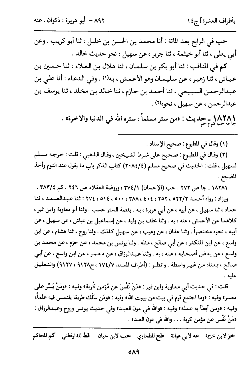 عه في البر والصلة: عن أبي أمية، ثنا منصور بن سعد، ثنا وهيب. وعن عباس الدوري، ثنا أمية بن بسطام، ثنا يزيد بن زُريع، ثنا روح بن القاسم، كلاهما عن سهيل، عن أبيه، به. وفي الدعوات: عن علي بن حرب والعطاردي - فرقهما - عن أبي معاوية. وعن الحسن بن عفان، عن ابن نمير. وعن أبي داود الحراني، عن محاضر. وعن الحسن بن عمر الرقي، عن أحمد بن عبد الملك، عن أبي عوانة، أربعتهم عن الأعمش، به. وفيه: "ومن يَسر على مُعْسر". وفيه: "والله في عون العبد". وفيه: "ما اجتمع قوم في بيت من بيوت الله". وفيه: "ومن سلك طريقاً يلتمَس فيه علماً ... " الحديث. ولم يذكر علي بن حرب الأخير، ولم يذكر ابن نمير: "من يسر ... ". وعن صالح بن عبد الرحمن بن عمرو بن الحارث، ثنا ابن أبي مريم. وعن إبراهيم بن مرزوق وسليمان بن سيف - فرقهما - عن القعنبي. وعن أحمد بن حيويه، ثنا ابن أبي أويس، كلهم عن سليمان بن بلال، به. وعن الربيع ابن سليمان، به. وعن أبي زرعة الرازي، ثنا إبراهيم بن حمزة. وعن الكابلي، عن سعيد بن منصور. وعن ابن الجنيد، ثنا الحميدي. وعن بحر بن نصر، عن محمد ابن إدريس الشافعي، كلهم عن الدرَاوَرْدي، عن ربيعة. وعن عبد الله بن أحمد بن زكريا بن الحارث بن أبي مسرة، ثنا أحمد بن محمد بن الوليد الأزرقي، ثنا الدرَاوَرْدي، عن ربيعة، به. قال الدرَاوَرْدي: ثم أتيت سهيلاً فسألته؟ فقال: حدثني ربيعة عني، عن أبي، ثم ذكره لي.