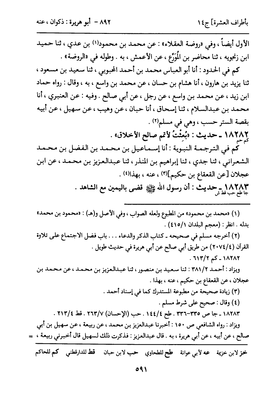 18283 - حديث (جا طح حب قط ش) : أن رسول الله - صَلَّى اللَّهُ عَلَيْهِ وَسَلَّمَ - قضى باليمين مع الشاهد.