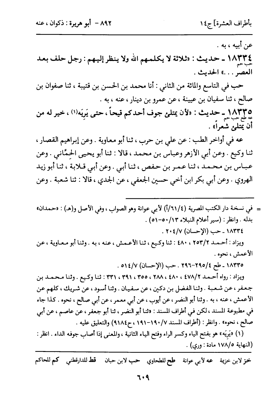 18334 - حديث (حب حم) : "ثلاثة لا يكلمهم الله ولا ينظر إليهم: رجل حلف بعد العصر ... " الحديث.