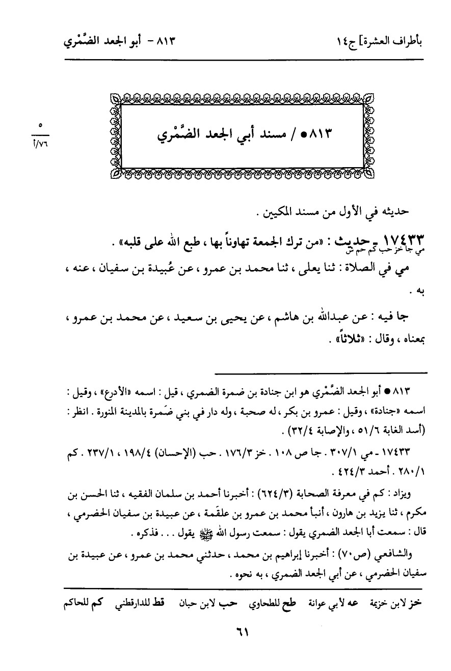 17433 - حديث (مي جا خز حب كم حم ش) : "من ترك الجمعة تهاوناً بها، طبع الله على قلبه".