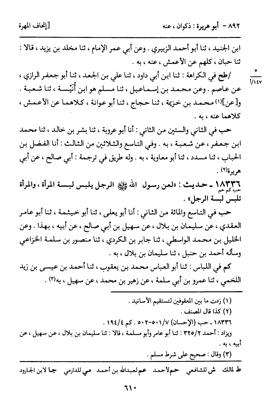 حب في التاسع والمائة من الثاني: أنا أبو يعلى، ثنا أبو خيثمة، ثنا أبو عامر العقدي، عن سليمان بن بلال، عن سهيل بن أبي صالح، عن أبيه، بهذا. وعن الخليل بن محمد الواسطي، ثنا جابر بن الكردي، ثنا منصور بن سلمة الخزاعي وسأله أحمد بن حنبل، ثنا سليمان بن بلال، به.