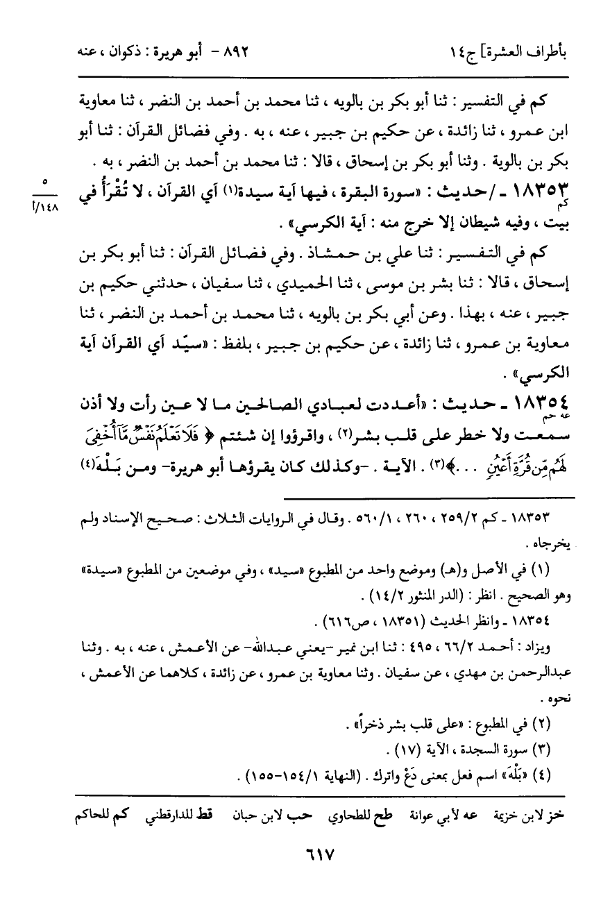 كم في التفسير: ثنا علي بن حمشاذ. وفي فضائل القرآن: ثنا أبو بكر بن إسحاق، قالا: ثنا بشر بن موسى، ثنا الحميدي، ثنا سفيان، حدثني حكيم بن جبير، عنه، بهذا. وعن أبي بكر بن بالويه، ثنا محمد بن أحمد بن النضر، ثنا معاوية بن عمرو، ثنا زائدة، عن حكيم بن جبير، بلفظ: "سيّد آي القرآن آية الكرسي".
