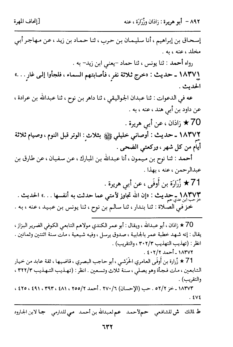 قال ابن عدي: رواه المسعودي، عن قتادة، عن زرارة بن أوفى، عن عمران بن حصين، وهو خطأ. ومنهم من رواه عن قتادة، عن أنس، وهو خطأ أيضاً، والصواب من قال: زرارة، عن أبي هريرة.