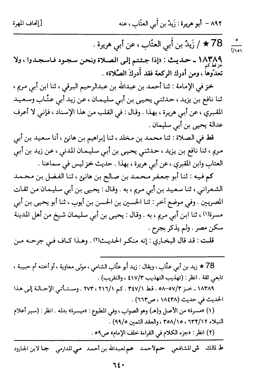 قط في الصلاة: ثنا محمد بن مخلد، ثنا إبراهيم بن هانئ، أنا سعيد بن أبي مريم، ثنا نافع بن يزيد، حدثني يحيى بن أبي سليمان المدني، عن زيد بن أبي العتاب وابن المقبري، عن أبي هريرة، بهذا. حديث خز ليس في سماعنا.