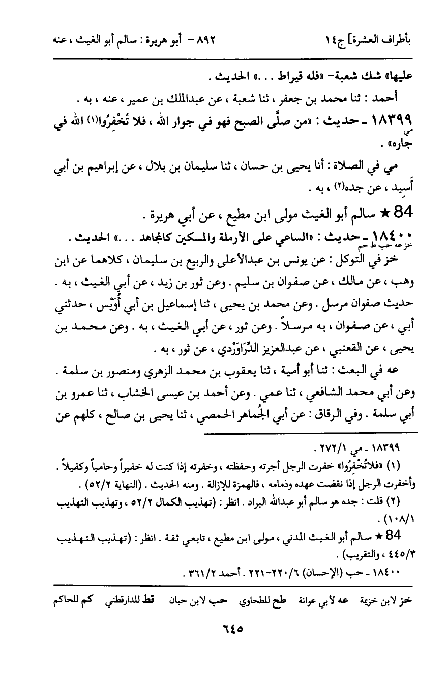 18400 - حديث (خز عه حب ط حم) : "الساعي على الأرملة والمسكين كالمجاهد ... " الحديث.
