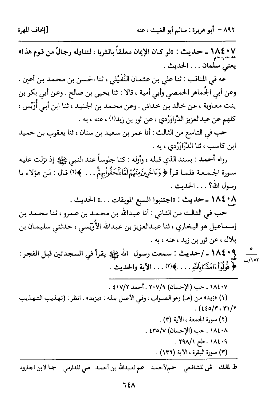 18407 - حديث (عه حب حم) : "لو كان الإيمان معلقاً بالثريا، لتناوله رجال من قوم هذا" يعني سلمان ... الحديث.