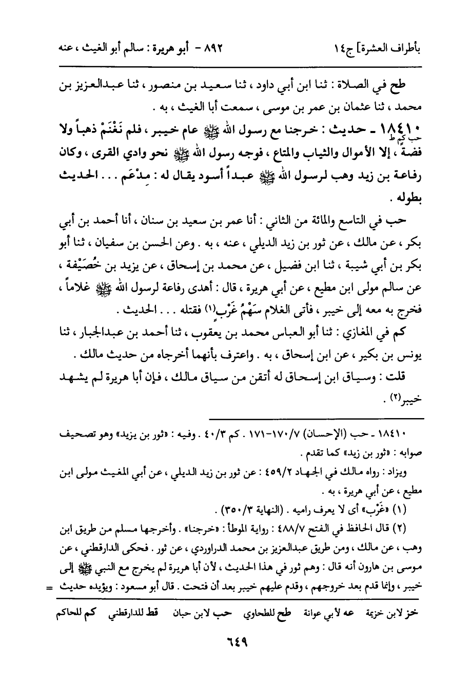 حب في التاسع والمائة من الثاني: أنا عمر بن سعيد بن سنان، أنا أحمد بن أبي بكر، عن مالك، عن ثور بن زيد الديلي، عنه، به. وعن الحسن بن سفيان، ثنا أبو بكر بن أبي شيبة، ثنا ابن فضيل، عن محمد بن إسحاق، عن يزيد بن خُصَيْفة، عن سالم مولى ابن مطيع، عن أبي هريرة، قال: أهدى رفاعة لرسول الله - صَلَّى اللَّهُ عَلَيْهِ وَسَلَّمَ - غلاماً، فخرج به معه إلى خيبر، فأتى الغلام سَهْمُ غَرْب فقتله ... الحديث.
