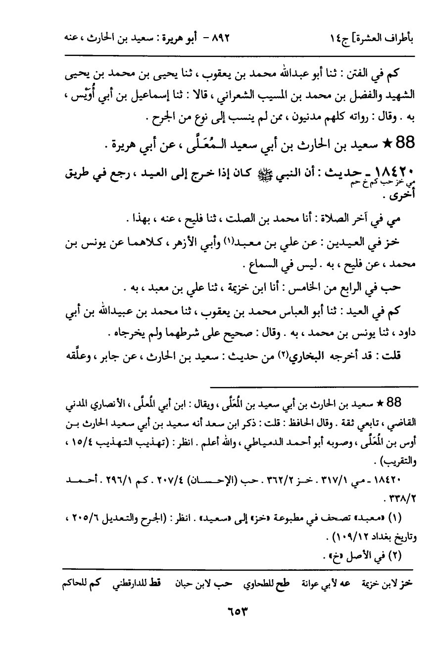 18420 - حديث (مي خز حب كم خ حم) : أن النبي - صَلَّى اللَّهُ عَلَيْهِ وَسَلَّمَ - كان إذا خرج إلى العيد، رجع في طريق أخرى.
