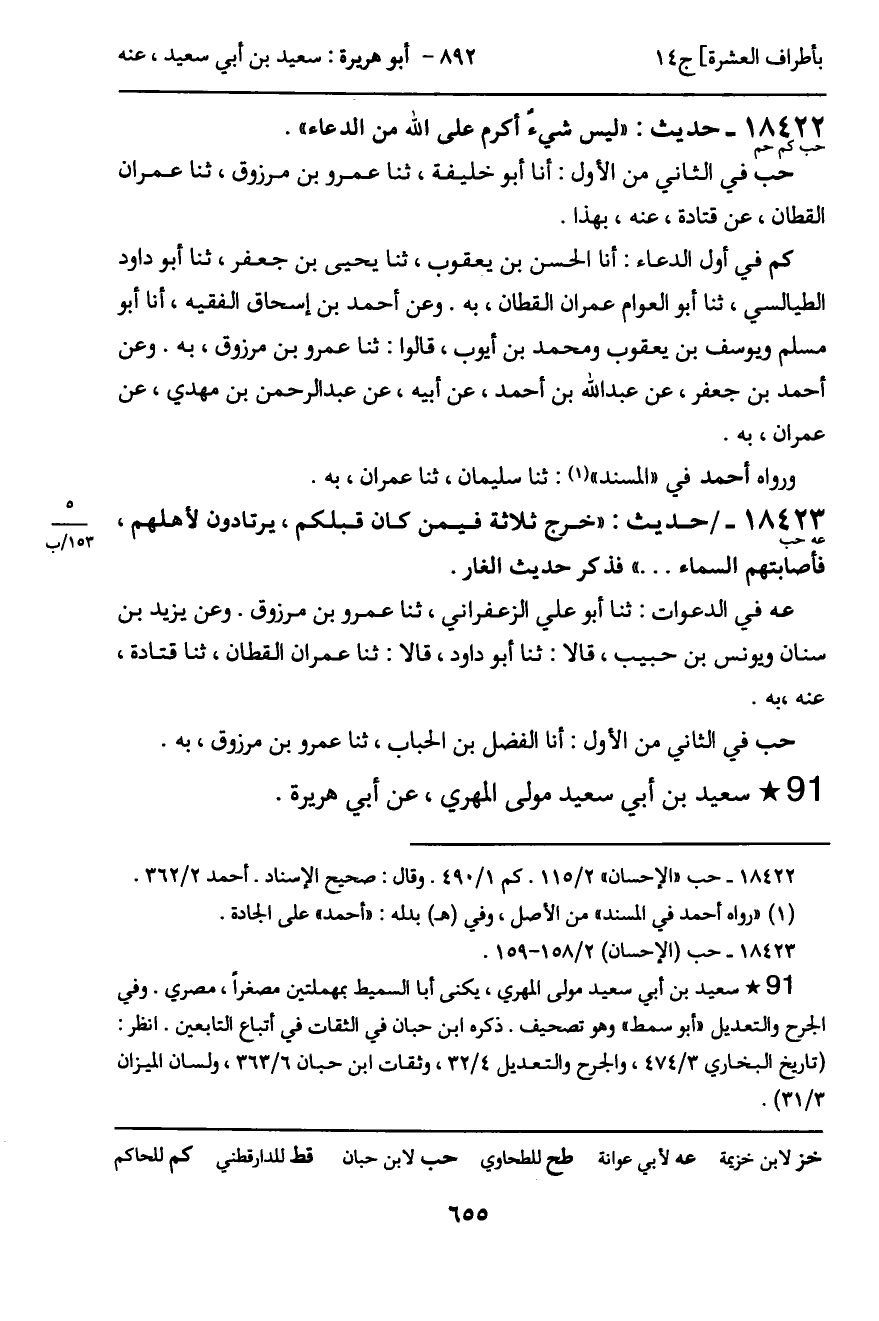 كم في أول الدعاء: أنا الحسن بن يعقوب، ثنا يحيى بن جعفر، ثنا أبو داود الطيالسي، ثنا أبو العوام عمران القطان، به. وعن أحمد بن إسحاق الفقيه، أنا أبو مسلم ويوسف بن يعقوب ومحمد بن أيوب، قالوا: ثنا عمرو بن مرزوق، به. وعن أحمد بن جعفر، عن عبد الله بن أحمد، عن أبيه، عن عبد الرحمن بن مهدي، عن عمران، به.
