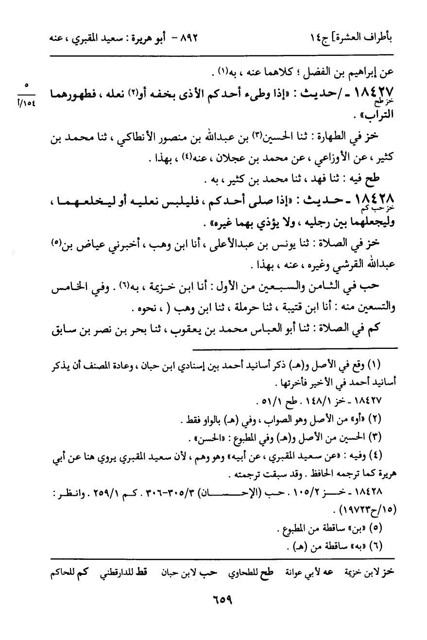 18427 - حديث (خز طح) : "إذا وطىء أحدكم الأذى بخفه أو نعله، فطهورهما التراب".