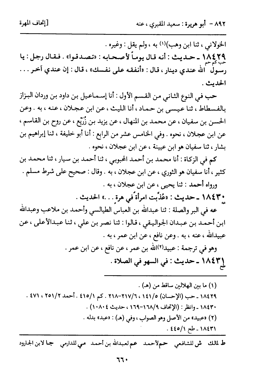 حب في النوع الثاني من القسم الأول: أنا إسماعيل بن داود بن وردان البزاز بالفسطاط، ثنا عيسى بن حماد، أنا الليث، عن ابن عجلان، عنه، به. وعن الحسن بن سفيان، عن محمد بن المنهال، عن يزيد بن زُريْع، عن روح بن القاسم، عن ابن عجلان، نحوه. وفي الخامس عشر من الرابع: أنا أبو خليفة، ثنا إبراهيم بن بشار، ثنا سفيان هو ابن عيينة، عن ابن عجلان، نحوه.